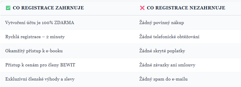 💡 Tip navíc: Jako člen BEWIT získáváte přístup k členským cenám a akcím, které nejsou dostupné pro neregistrované zákazníky. Registrace se tedy vyplatí dvojnásob!