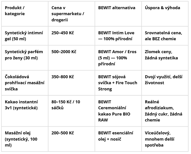 Tady přichází příjemné překvapení! Přírodní produkty BEWIT nejsou jen zdravější — jsou i ekonomicky výhodnější oproti nákupu srovnatelných produktů v supermarketech nebo drogériích.